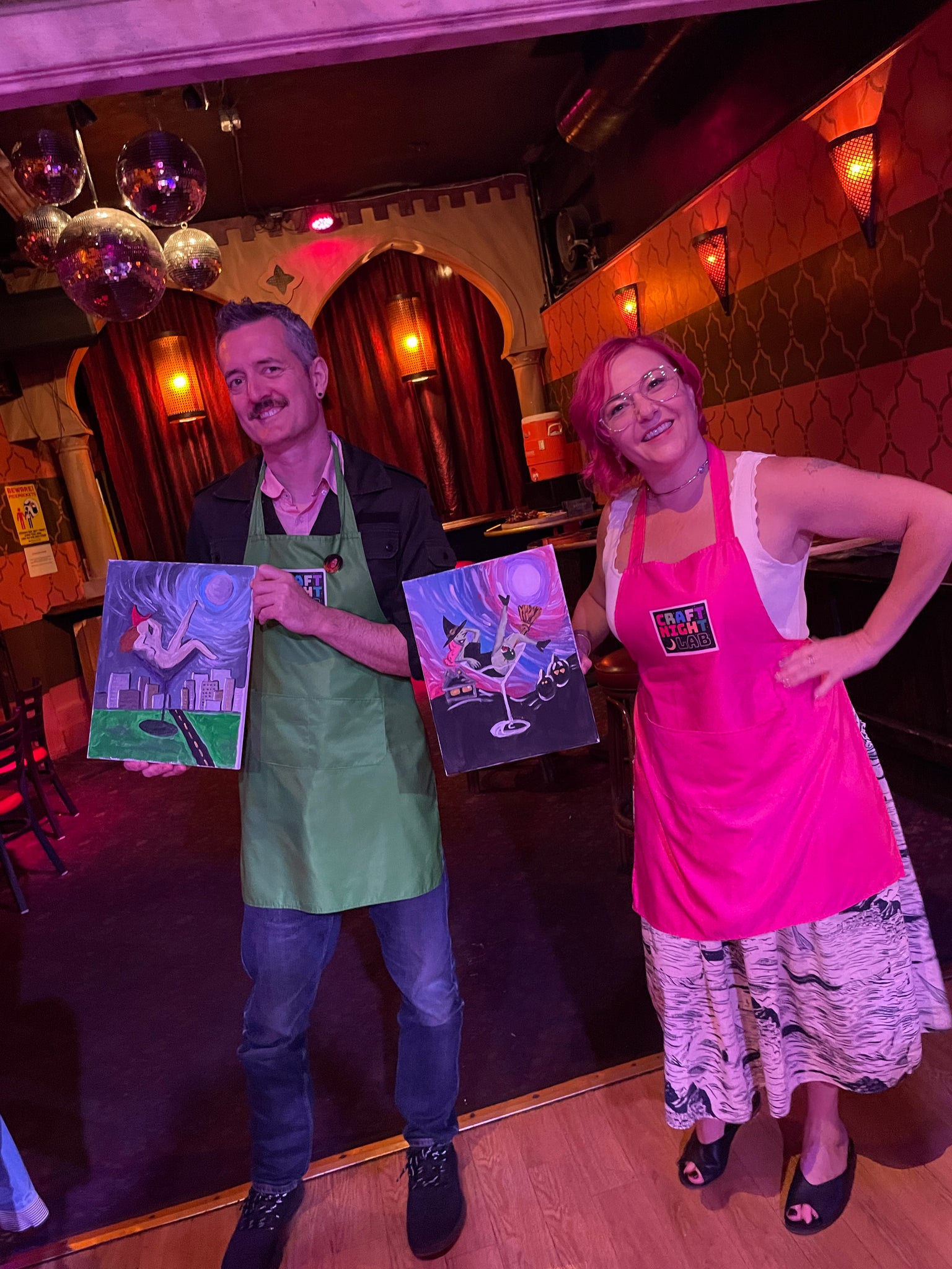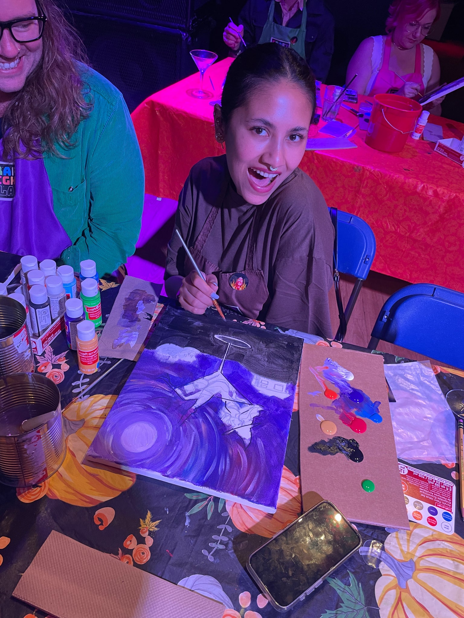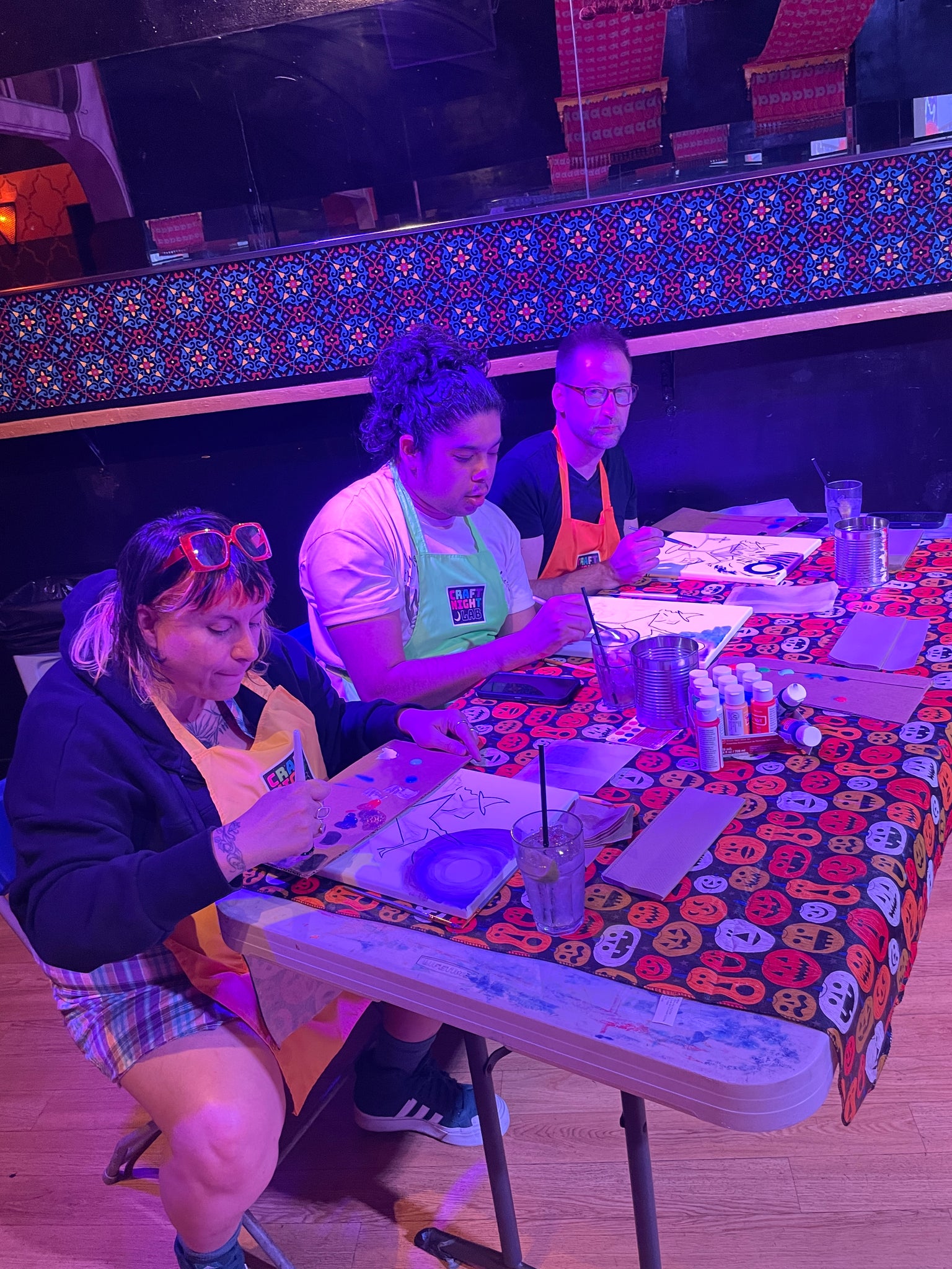 Expert Guidance: I've been painting all my life! I will provide clear instructions and helpful tips, ensuring you'll feel confident and successful making your painting. A projector is used to broadcast on a big screen as I paint so you can work along with me. I visit each station and answer questions or help you out if you get stuck. Also no stress! We're not painting the sistine chapel, we're having FUN and not taking ourselves too seriously.