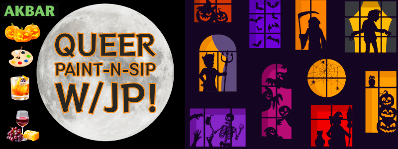Time for some Halloween, charcuterie, spirits, and an LGBTQ+ paint & sip workshop with JP Craft Captain! I'll guide you step-by-step to create a trio of spirited jack'o'lanterns in a spellbinding tableau.
